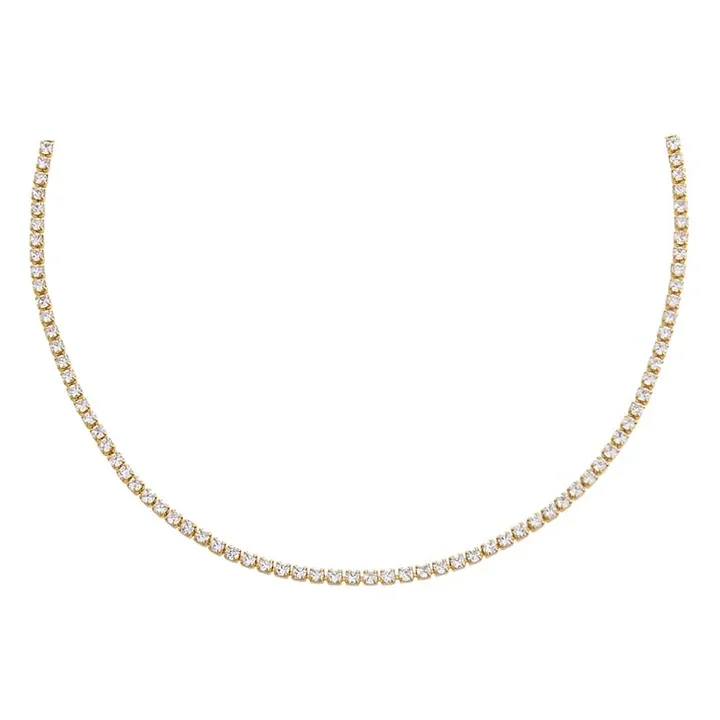 Elevate your jewelry collection with the Thin Tennis Choker, a timeless piece that exudes elegance and sophistication. Crafted from high-quality brass and plated with luxurious 14K gold, this choker features a stunning array of clear CZ stones, each measuring 2 mm in size. The delicate design ensures a refined and elegant look, perfect for adding a touch of sparkle to any outfit. With a length of 12 inches plus a 3-inch extender, this gold-plated choker provides a versatile and adjustable fit to suit any neckline. Whether for everyday wear or special occasions, the Thin Tennis Choker is a must-have accessory that seamlessly blends classic style with modern luxury. Add this exquisite piece to your collection and enjoy the perfect blend of sophistication and glamour.