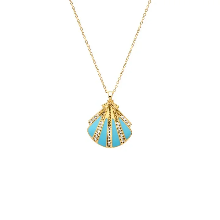 Turquoise Enamel & CZ Seashell Pendant Necklace